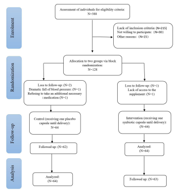ParticipantsParticipants were enrolled in the study from February 2020 to January 2021 (Figure 1). Out of 128 eligible women with mild PE, two patients (one in the intervention group and one in the control group) discontinued receiving the supplement. Also, another participant in the intervention group withdrew due to hypotension. There was no loss to follow-up, and since data analysis was based on the ITT approach, the data of all 128 mothers were analyzed at the end of the intervention period. Other participants (97.65%) consumed all the capsules provided to them during the intervention period.