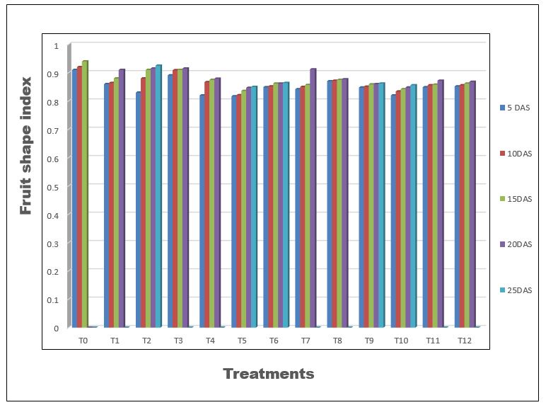 T2 (CaCl₂ 4% + Paraffin Wax 12% + LDPE) retained the fruit shape index best, with a value of 0.925, followed by T10 (CaCl₂ 4% + Paraffin Wax 12% + CFB) at 0.856. In contrast, the control showed a much lower value of 2.77. This suggests that these treatments provided structural support, helping to reduce moisture loss and prevent mechanical damage to the fruit [13,14].