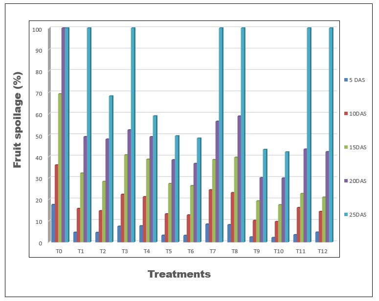The lowest spoilage rate was observed in T10 (CaCl₂ 4% + Paraffin Wax Emulsion 12% + CFB) at 42.09% after 25 days, followed by T5 (CaCl₂ 2% + Paraffin Wax Emulsion 10% + Cling Film) at 49.62%. In contrast, the control group showed complete spoilage (100%). The antimicrobial properties of calcium chloride, combined with the protective paraffin wax coating and the physical barrier of CFB, helped limit microbial growth and fruit decay. The higher spoilage in the control samples was likely due to a weaker defense against fungal infections and increased respiration, which led to shriveling [15,16].