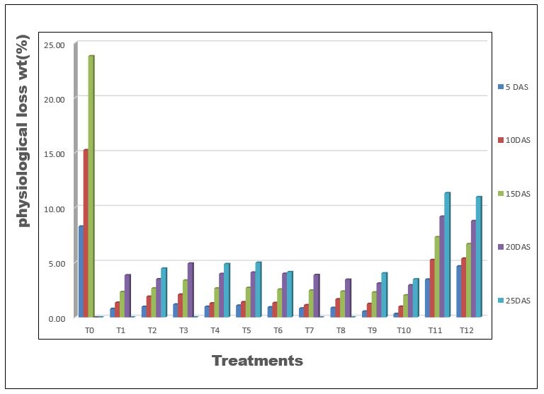 The best preservation of fruit length and girth was recorded in T5 (CaCl₂ 2% + Paraffin Wax 10% + Cling Film), with an average fruit length of 5.35 cm and a girth of 6.7 cm after 25 days. These measurements were significantly greater than those of the control, which had a length of 2.98 cm and a girth of 3.2 cm. The wax coating played a crucial role in minimizing moisture loss, which helped prevent shrinkage and maintained the integrity of the fruit’s cell walls. Similar results were reported by [11], who found that wax coatings reduced transpiration, helping to retain fruit firmness and prevent shrinkage [12].
