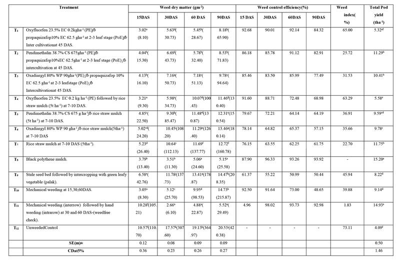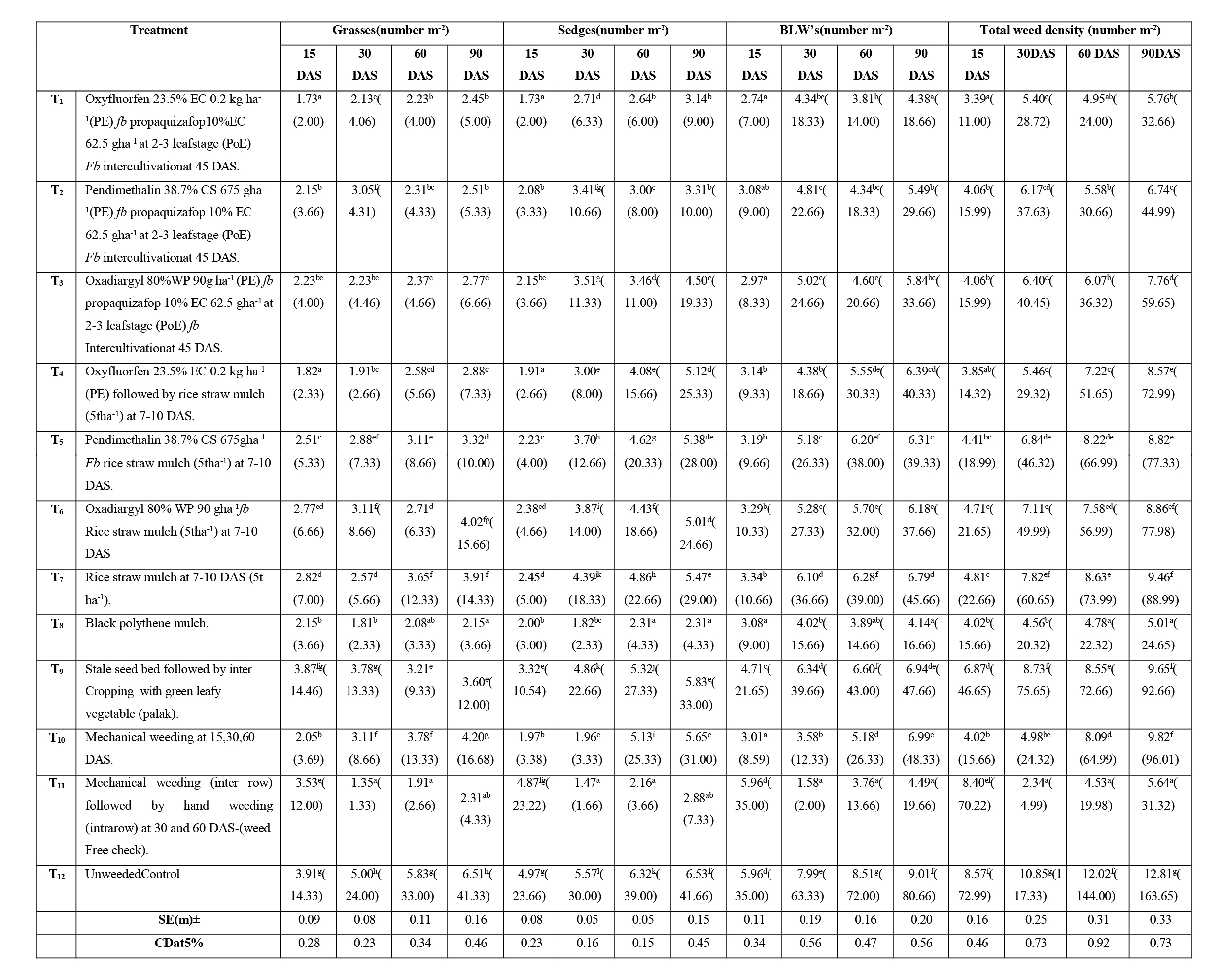 - T1: Oxyfluorfen 0.2 kg/ha (pre-emergence) + propaquizafop 62.5 g/ha (post-emergence) + intercultivation at 45 DAS