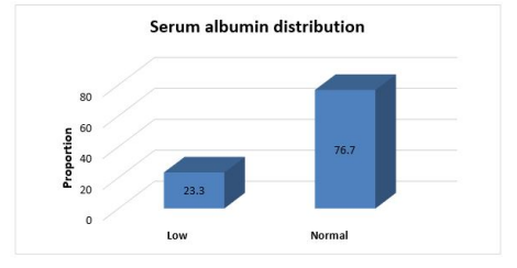 Only 23.3% (n=37) had low serum albumin and 76.7% (n=122) had normal level of serum albumin. D:A:D CVD risk at 5 years distribution among participants is described in Table 22. Around 28.9% (n=46) had very high risk of D:A:D CVD at 5 years and 20.8% (n=33) showed high risk.