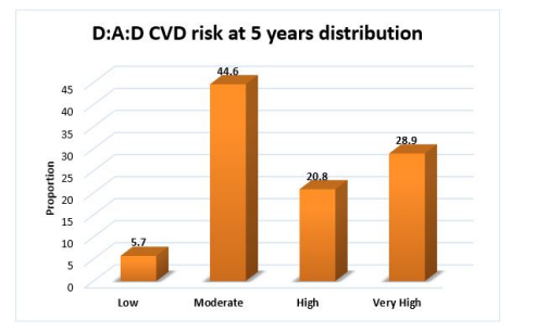 Among 159 patients, 37(23.3%) patients had low Albumin. D:A:D CVD risk at 5 years distribution among participants was calculated, around 28.9% (n=46) had very high risk of D:A:D CVD at 5 years and 20.8% (n=33) showed high risk.