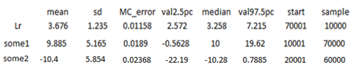Furthermore, the parameters that measures the overall difference in failure rate are the likelihood ratio (Lr), the posterior distributions of some1 (4.4.6) and the posterior distribution of some 2 (4.4.7. In this analysis, the Lr has a posterior mean of 3.676, a median of 3.258 and a 95% credible interval of (2.572, 7.215) Table 1.2), imply that there is evidence that the two combinations do not differ in failure rates.