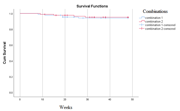 When the treatments are repeated under the same condition with new data each time, only in 5% of the times the null hypothesis will be rejected wrongly (when it is actually true). Table 2.1 give a Log- Rank value of 2.788 with a p- value of 0.248, means there is no significance difference in efficacy between combinations 1 and 2 at 5% level of significance.