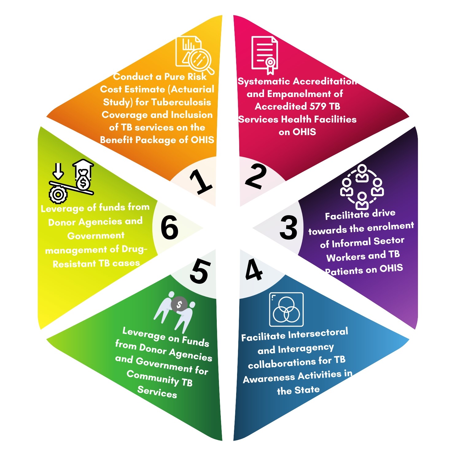 The integration roadmap developed involves a six-step integration process (Figure II). The steps entail: Conducting a pure risk cost estimate (Actuarial Study) for TB coverage and inclusion of TB services on the benefits package of OHIS; Systematic accreditation and empanelment of all accredited public and private health facilities providing TB Services as a service provider on OHIS; Facilitating drive towards accelerated enrolment of informal sector workers and TB patients in OHIS; Facilitation of intersectoral and interagency collaborations for TB awareness activities in the state; Leveraging on funds from government and donor agencies for community TB services; and Leveraging on funds from government and donor agencies for the management of drug-resistant TB cases.