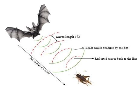 The figure 3 illustrates how bats use echolocation to locate their prey. Bats emit high frequency sound waves, known as sonar waves, in the form of pulses. These waves travel outward until they encounter an object, such as a cricket. Upon hitting the object, the waves reflect back to the bat. By analyzing the time, it takes for the sound waves to return, as well as changes in their frequency and intensity, the bat can determine the distance, size, shape, and movement of the prey. This process enables bats to navigate and hunt effectively in complete darkness, relying on sound rather than vision. The main purposes of development of modern metaheuristic algorithms are to: solve problems faster, solve large complex problems, and obtain robust solutions [14].