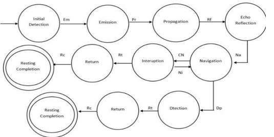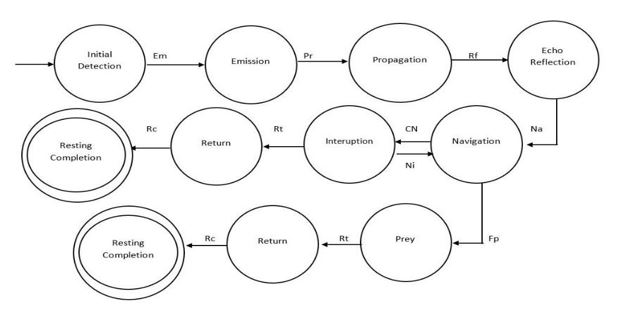 In the prey detection phase, the bat emits echoes to find food. It sends out sound waves and listens for the returning echoes, which help it locate prey based on size, movement, and position. In a similar manner, echolocation-based sensor networks utilize similar principles to detect and track targets in complex environments [15]. This process allows the bat to effectively detect and target its food. this shown in Figure 7-Transition Graph for Detection of Predator.
