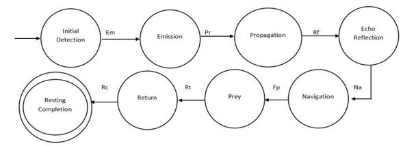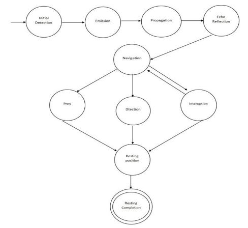 Bats contribute to the maintenance of environmental stability through ecosystem provisioning and regulating services such as insect pest control [19]. The research paper serves as the foundation for modeling automata transitions between states, such as emission, propagation, echo reflection, and navigation. Regular languages and expressions are utilized to simulate various scenarios, including noise interruptions, prey detection, and predator avoidance. DFA enhances understandability and streamlines the optimization process.
