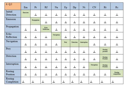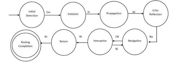 R.L = { Initial Detection, Emission, Propagation, Echo Reflection, Navigation, Find Food, Detect Predators, Return, Noise Interruption, Resting Point, Resting Completion}