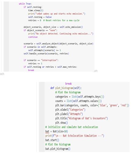 - These lines create a Bat object, start the simulation using the start method, and finally display the histogram using the plot histogram method.