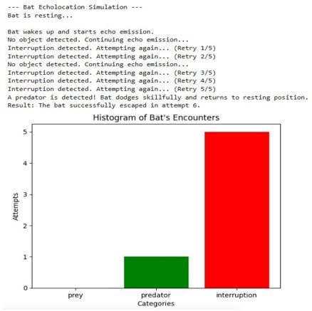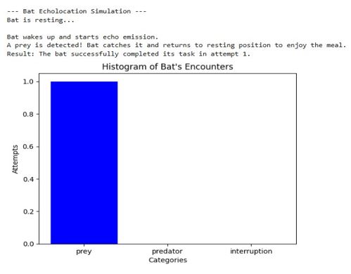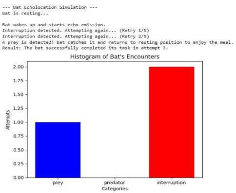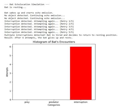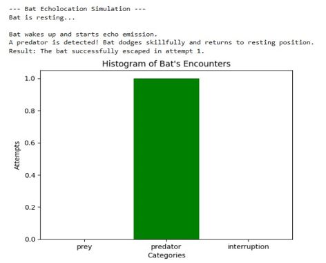 - plot_histogram: This method creates a histogram to visualize the number of times the bat encountered each type of object (prey, predator, interruption).