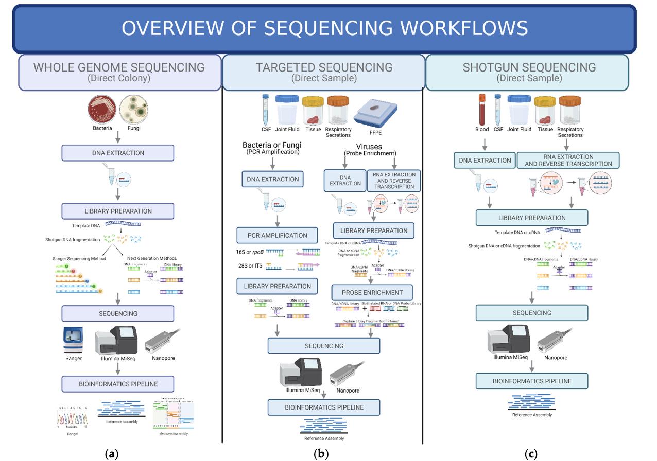 Shotgun metagenome sequencing is a technique that, in contrast to targeted sequencing, casts a larger net since every nucleic acid in a sample is sequenced (Figure 1). Almost all pathogens, including bacteria, fungi, viruses, and parasites, can be detected with a single test thanks to whole genome sequencing. Sequencing has been shown effective in identifying infections from a wide range of material types, including typically sterile sources like joint fluid and CSF blood [23]. Furthermore, it has been shown to assist in the identification of an infectious agent in specimen categories, such as respiratory tract specimens, when a documented microbiome is present. Urine and gastrointestinal specimens. This methodology has been applied as an LDT in several laboratories, which function as patient clinical reference testing centres [24]. The first is a comprehensive metagenomics sequencing test of CSF offered by the University of California, San Francisco (UCSF) clinical microbiology laboratory, which is CLIA-certified. With a clinical sensitivity and specificity of 73% and 99%, respectively, this test has an overall accuracy of 90%. Numerous case reports, including those involving Taenia soliuminfection, West Nile virus, and neuro brucellosis, demonstrate the diagnostic value of this test in situations where all other conventional diagnostic testing was negative. Compared to the traditional direct detection testing of CSF (culture, antigen testing, or quick molecular approaches), the shotgun metagenomics CSF test detected a higher number of infections [25].