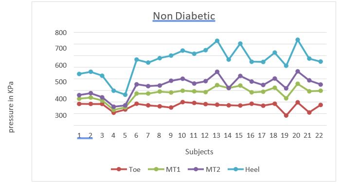 The graph above illustrates plantar pressure data measured at four key points: the Toe, First Metatarsal Head, Second Metatarsal Head, and Heel in normal, non-diabetic subjects. The pressure values range from 0 to 800 KPa. The X-axis represents the individual subjects, while the Y-axis indicates the corresponding plantar pressure in kilopascals (KPa).