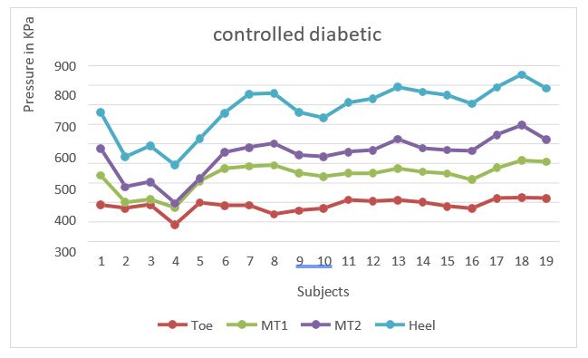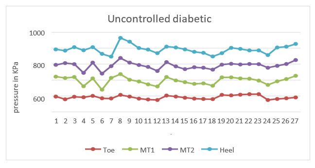 This graph represents pressure at four points in uncontrolled diabetic patients. Pressure levels are elevated beyond 700Kpa.It ranges between 7500Kpa to 950Kpa. X axis shows subjects and Y axis shows pressure in KPa.