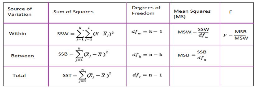 SSW = Sum of squares within the groups SSB = Sum of squares between the group’s SSE = Sum of squares due to error