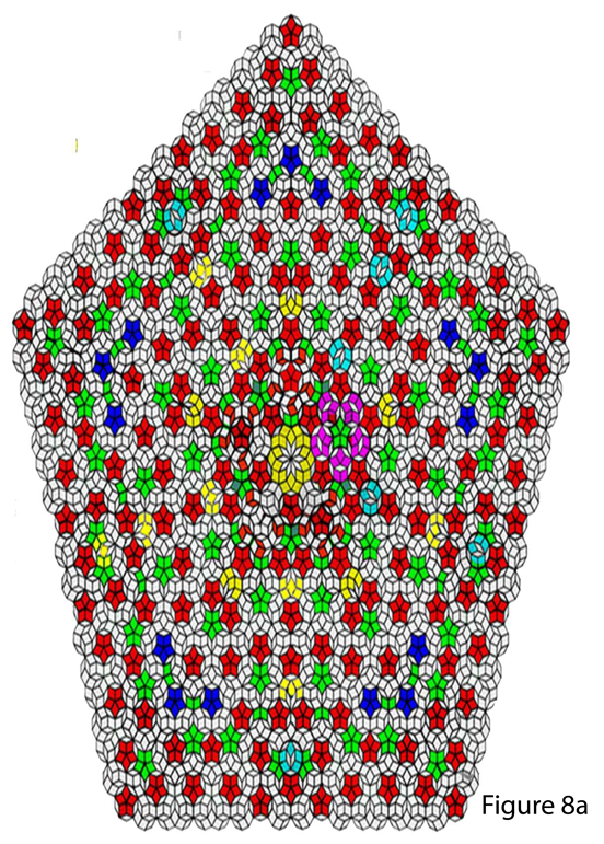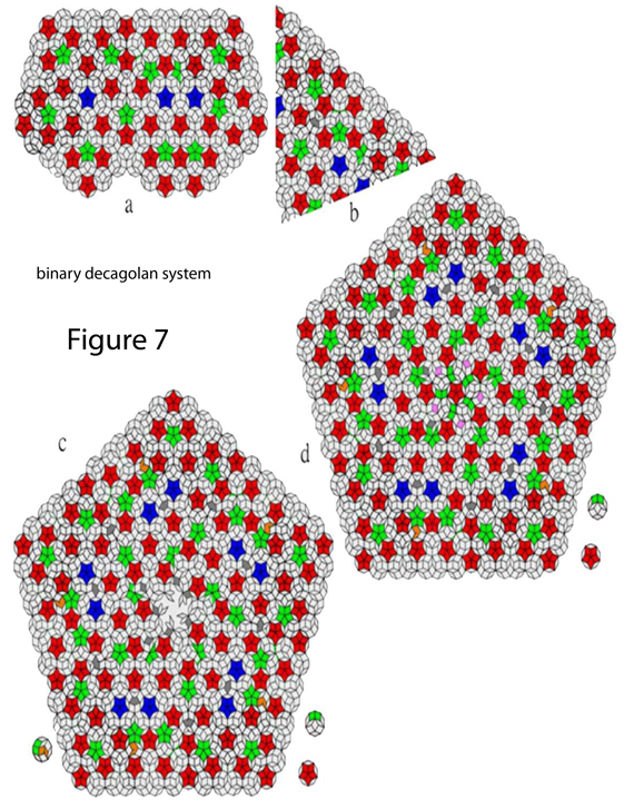Figure 5a shows the results of tessellation (splicing) based on the graph (mirror symmetric triangle) in Figure 4b. Combination of degree splices include: first 72-degree rotation, second 144-degree, third 216 degree and finally 288 degree rotation. Following the fifth round of splicing (that is, after the first round of coupling), a larger pentagon Penrose tile with ten decagons on each side is constructed. The defects created during the tessellation process in the seam regions are shown in Figure 5, where all defective decagons are clearly reversed to the type-b decagons. Using the same procedure applied to the graph in Figure (5), after further extended coupling, error-free binary Penrose tiles with 20 decagons on each side can be obtained, as shown in Figure 6.