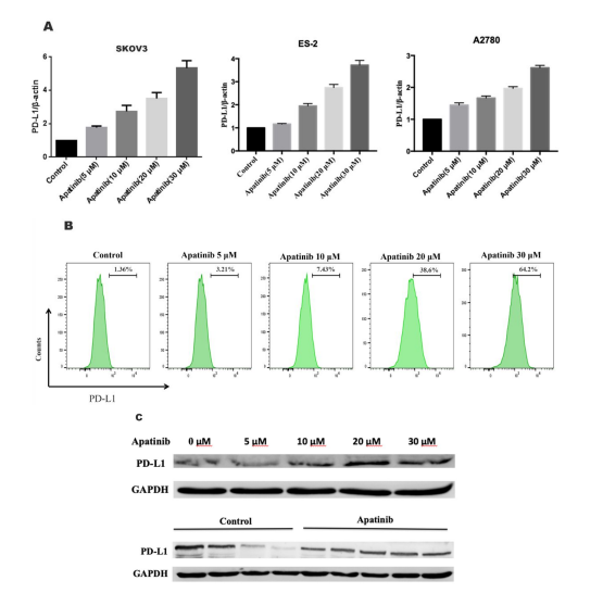 Apatinib Increases the Expression of PD-L1 in Ovarian Cancer Cells and in vivo ModelsTo investigate the effect of apatinib on PD-L1 expression in ovarian cancer cells, we selected the ovarian cancer cell lines SKOV3, ES-2, and A2780 and incubated them with different concentrations of apatinib (0, 5, 10, 20 and 30 μM) for 24 h. qRT‒PCR showed that apatinib upregulated the mRNA expression of PD-L1 in a dose-dependent manner and was most effective at 30 μM (Figure 1A). The qRT‒PCR results showed that the increase in PD-L1 mRNA expression in the SKOV3 ovarian cancer cell line was the most obvious. Therefore, in the following experiments, we selected SKOV3 ovarian cancer cells for study. Cells treated with apatinib were harvested and subjected to flow cytometry and western blot analysis. The PD-L1 protein level in the cells was increased after apatinib treatment (Figure 1B). Western blotting was used to explore the effect of apatinib on the expression of the PD-L1 protein in mouse tumour tissues. The results indicated that the expression of the PD-L1 protein in tumour tissues increased after the administration of apatinib (Figure 1C).