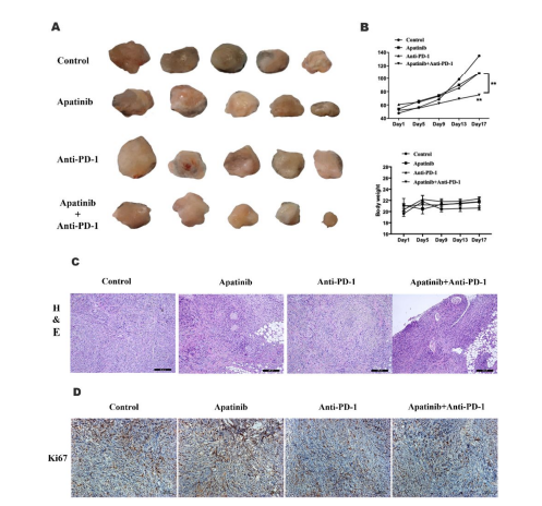 Conclusions: Our study showed that apatinib upregulates the expression of PD-L1 to exert antitumour effects. Apatinib in combination with an anti-PD-1 antibody increased the immune response to lead to a remarkable reduction in tumour growth, providing evidence for clinical trials.