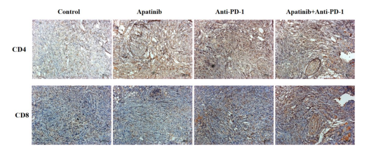 Apatinib Combined with an Anti-PD-1 Antibody Increased the Infiltration of CD4+ T cells and CD8+ T cells in vivoThe combination treatment had a significant antitumour effect on, and we investigated whether the four treatments had an impact on T-cell infiltration. The infiltration of CD4+ and CD8+ T cells in tumour tissue was examined by IHC. As shown in Figure 3, apatinib alone or anti-PD-1 therapy alone promoted the expression of CD4 and CD8. However, the apatinib combined with anti-PD-1 antibody group were further increased, as determined by IHC (Figure 3). The results suggested that the combination treatment increased the infiltration of CD4+ and CD8+ T cells compared with single-drug-treated group in the TME. This enhances the activation of T cells to promote antitumour effects.