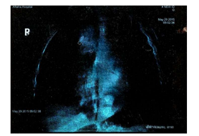 recessions, with respiratory rate of 30 breaths per minute. He had aloud respiratory grunt. The chest expansion was reduced which was dull on percussion. Asculation revealed a marked reduction of air entry over the mid and upper zones. Chest-X ray showed a well demarcated opacity involving the upper and mid zones. Ultrasound scan of the chest revealed fluid-filled right costophrenic angle, suggesting a pleural effusion.
