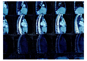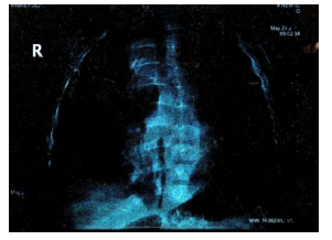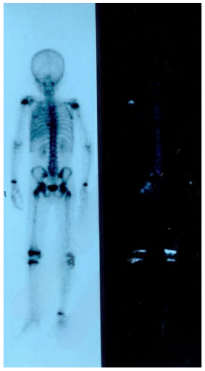 Bone scintigraphy: foci of enhacement of the material (radioactive Technetium) in the distal third of the thight, with increased fixation of the radioactive material in the posterior end of the eight vertebra, no metasis.