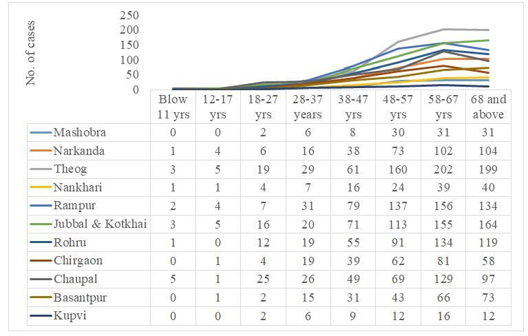 Figure 1 shows that there is a clear trend toward increasing cancer incidence with advancing age. The cases are minimal in the youngest age groups and increase significantly from 28 years onwards, peaking in the 58-67 years age group. Theog consistently reported the greatest number of cases across all age groups, particularly those aged 38 years and older. Rampur and Jubbal & Kotkhai also had high incidences, especially in the middle to older age groups. Regions such as Chopal, Rohru, and Chirgaon exhibited a lower but still significant number of cases, particularly in older age groups.