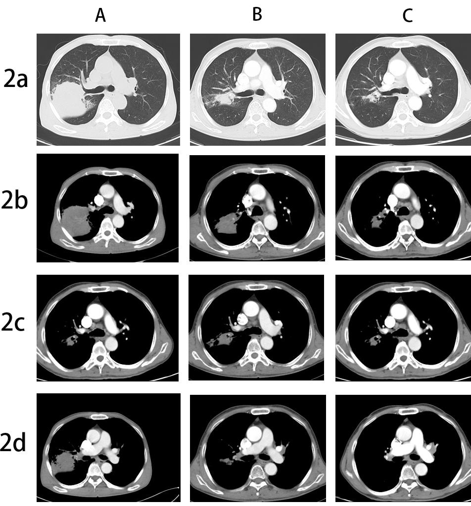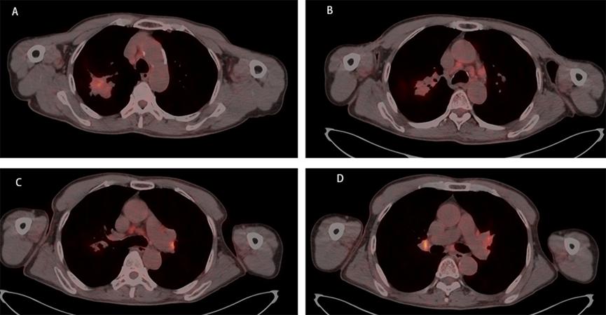 A 67-year-old male, with a continuous smoking history of over 30 years, was admitted to hospital for blood in phlegm half a month and was diagnosed as right lung upper lobe adenocarcinoma with right hilar and mediastinal lymph node metastasis examined by PET-CT. CT-guide needle biopsy was performed, and subsequent HE staining and immunohistochemistry confirmed adenocarcinoma with PD-L1(+,5%). Quantitative polymerase chain reaction (qPCR) assay of 10 genes in primary tumor tissue showed G12S\G12D mutation in exon 2 of KRAS gene. Neoadjuvant chemotherapy is administered to patients anticipated to benefit from subsequent adjuvant chemotherapy; however, it only modestly enhances 5-year recurrence-free and OS rates by about 5% to 6% [7]. The incorporation of immune checkpoint inhibitors (ICIs) into neoadjuvant chemotherapy demonstrates potential, having a minimal impact on the likelihood of significant perioperative complications or mortality, while presenting new opportunities for managing treatable NSCLC, with a major pathological response rate varying between 21% and 45%. Additionally, induction with ICIs does not increase toxicities that could delay surgical interventions [8]. Following the results of the CheckMate-816 study, immunochemotherapy is now suggested as a neoadjuvant approach [9]. After discussing in the multidisciplinary team (MDT), in view of the difficulty of operation, three cycles of neoadjuvant Camrelizumab(anti-PD-1 antibody) combined with pemetrexed and carboplatin were administered to the patient. However, repeat imaging after two cycles demonstrated concern for disease progression with right mediastinal lymph node increased and new left hilar and mediastinal(4L) lymph node metastasis. But the right upper lung lesions became significantly smaller with the tumor biomarker, CEA, NSE and Cyfra21-1 continued to decline (Figure 1). However, the side effects of immunochemothrapy are small, with no high-grade toxicities, the patient chose to continue to receive one more cycle treatment. Repeat imaging after one more cycle treatment demonstrated that decreasing of the primary lesion but stable right mediastinal and left hilar and mediastinal lymph node (Figure 2a-d). Positron emission tomography-computed tomography (PET-CT) was performed and showed that the local residual tumor with slightly high FDG metabolism, hilar and mediastinal lymph node enlargement with high FDG metabolism (Figure 3A-D). After the re-MDT, it was considered that the tumor shrank significantly and the tumor markers continued to decrease. The nature of the contralateral hilar lymph nodes was the same as that of the 4L group lymph nodes. It is recommended to complete the EBUS-tbna examination and puncture the 4L group lymph nodes. Lymph node biopsy of group 4L lymph node by Ebus-tbna showed no cancer tissue was found. In view of the possibility of pseudoprogression, after a sufficient communication, the patient underwent a right lung upper lobectomy and hilar and mediastinum lymph node dissection. Surgical pathology showed there was no residual cancer tissue, which achieved pathological complete remission, and the enlarged lymph nodes including 4L were presented as change after immunotherapy, no visible tumor cells existed. Now, the patient had finished all treatment and reexamination periodically for 13 months, no evidence of relapse or metastasis exist.