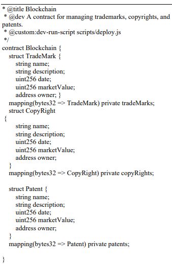 Explanation: This segment of code defines the primary contract called "Blockchain." Within this contract, we define structures for trademarks, copyrights, and patents. Each structure contains details like name, description, date, market value, and the owner. The mappings then associate unique identifiers to these structures, ensuring easy and secure storage and retrieval.