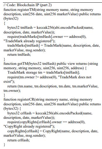 The provided code encompasses three essential functions dedicated to the registration and retrieval of trademarks and copyrights within the blockchain-based Intellectual Property (IP) management system. Each function serves a distinct purpose in the efficient management of intellectual property rights. The following section elaborates on the functionality of these functions: