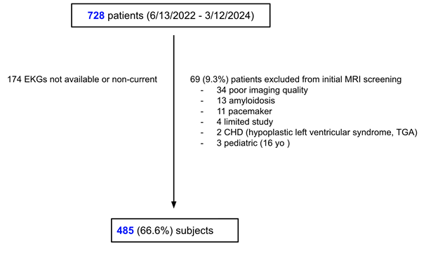 Between 13 June 2022 and 12 March 2024, a total of 728 cMRI studies were conducted at a single site. Of these, 243 subjects were excluded from further analysis for the following reasons: 34 due to poor imaging quality, 13 with amyloidosis, 11 with pacemakers, 4 with limited study scope, 2 with complex congenital heart diseases (1 hypo plastic left heart syndrome and 1 transposition of the great arteries), 3 pediatric patients (age <18 years), 174 with unavailable or non-current electrocardiograms (EKG). Consequently, 485 subjects (66.6%) were included in the final analysis (Figure 2).