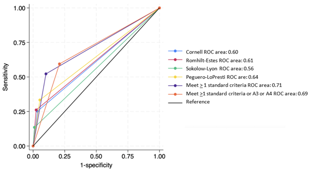The Peguero-LoPresti criteria demonstrated the highest sensitivity (33.3%), while the Sokolow-Lyon criterion had the highest specificity (98.9%). However, Sokolow-Lyon showed both the lowest sensitivity (13.5%) and overall AUC (0.56; P < 0.05). Although the Peguero-LoPresti criteria achieved the highest AUC (0.64), it did not demonstrate statistical significance compared to Cornell or Romhilt-Estes. All traditional criteria had a specificity of at least 95%.