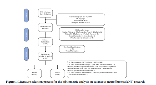 Methodologies for Search and Collection of DataIn academic circles, the bibliometric analysis data extracted from WoS enjoys widespread credibility as the most reliable data source [12]. For the present study, we undertook a thorough literature search using the Web of Science Core Collection (WoSCC) database, encompassing the period from January 1, 2003, to December 31, 2022. To achieve a comprehensive and precise outcome, we deployed the following search strategy: ((TS=(cutaneous) OR TS=(- derma*) OR TS=(skin))) And ((TS=("neurofibromatosis type 1") OR TS=(“neurofibromatosis 1") OR TS=("von Recklinghausen’s disease") OR TS=("von Recklinghausen neuro- fibromatosis") OR TS=("von Recklinghausen’s phakomatosis") OR TS=("peripheral neurofibromatosis")))OR(TS=("cutaneous neurofibroma*" ) OR TS=("skin neurofibroma*" ) OR TS=("dermal neurofibroma*")). We confined our search to articles and reviews, while excluding other document types, such as meeting abstracts, letters, and editorial materials. Ultimately, our analysis comprised 927 records, and the particulars of the literature screening process are elaborated in Figure 1.