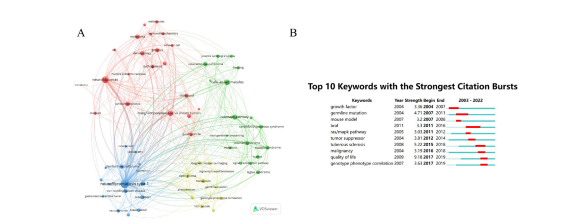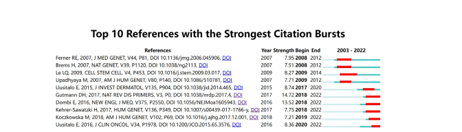 Analysis of co-occurring KeywordsA total of 66 keywords were found to have a minimum of 4 occurrences out of 1842 keywords. Based on the collective frequency distribution of these 66 keywords, we classified them into 4 distinct clusters utilizing vosviewer (as depicted in Figure 10A). Cluster #1 (colored red) predominantly comprises neurofibromas, schwannomas, and MPNSTs; cluster #2 (colored green) mostly encompasses cutaneous neurofibromas, café-au-lait spots and ras/mapk pathways; cluster #3 (colored blue) primarily includes neurofibromatosis type 1, plexiform neurofibromas and mek inhibitors; and cluster #4 (colored yellow) mainly encompasses genotype- phenotype correlation, tuberous sclerosis and mosaicism. The identification of bursts is deemed as an indicator of the fluctuating trends within certain fields or emerging topics across different timelines. Figure 10B illustrates the top ten keywords with the most potent burst intensity. In this figure, "Year" denotes the year of the first emergence of the keyword, while "Begin" and "End" respectively denote the inaugural and the final years of the reference burst where the said keyword appeared. Based on the depicted figure, recent research hotspots highlight "quality of life" and "genotype phenotype correlation".