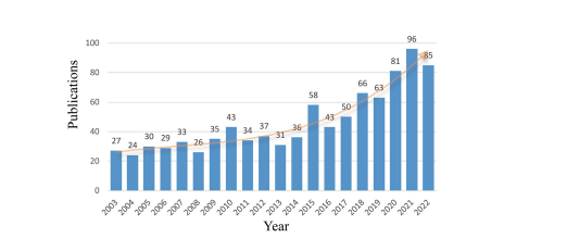 40. The majority of annual volumes fluctuated between 25-40. In contrast, the second phase encompasses the time period of 2015-2022, where the number of published articles ascended abruptly to 58 in the year 2015. Subsequently, the annual volumes of published articles remained higher than 40, peaking at 96 articles in 2021, which is 3.5 times more than that in 2003.