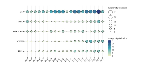 For the foremost five nations, we present the annual variations in the publication count, as exemplified in Figure 3. The size and hue of the circles concomitantly mirror the number of publications. Notably, Germany's publication count has exhibited rather steady progression over the prior two decades, while the remaining nations display comparatively ascending tendencies in recent years. In particular, China's publication count has markedly exceeded previous figures over the last five years, thus suggesting that China shall contend a more prominent position in this domain going forward.