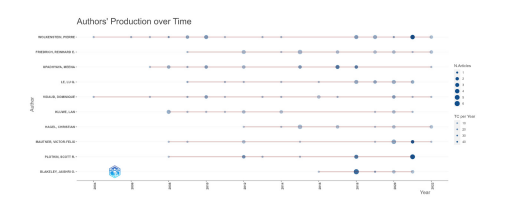 The Bibliometrix software package, developed by Dr. Massimo Aria and Corrado Cuccurullo of Naples University in Italy, is an open-source tool that enables thorough analytical inquiry into bibliometrics and scientometrics [20]. In this study, the software was implemented to promote assessment of authors' H-index and publications evolution over time.