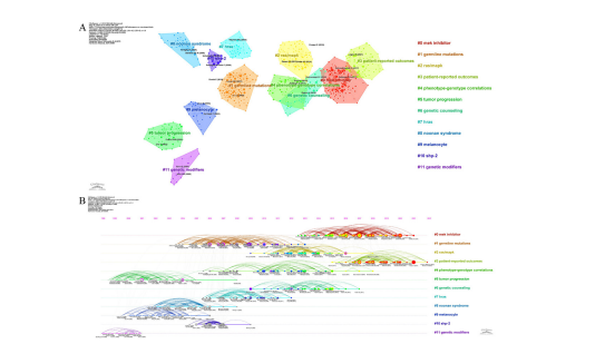 Trends and Content of Cited LiteratureThe co-reference network affords an exposition of the interrelations among diverse references, which is predicated upon their co-citation frequency and similarity. By virtue of the clusters that emerge from this network, one can identify groups of references that exhibit similarity in topics or themes, and thereby reveal key research areas, in- fluential papers, and evolutionary trends within a given field or domain [23]. The clusters that derive from the CiteSpace software are visually represented in Figure 8A, where the top 12 clusters are depicted by using the log- likelihood ratio (LLR) algorithm. The image epitomizes a variety of convex hulls which correspond to distinct clusters, such as mek inhibitor (cluster #0), germline mutations (cluster #1), ras/mapk (cluster #2), patient-reported outcomes (cluster #3), phenotype-genotype correlations (cluster #4), tumor progression (cluster #5), genetic counseling (cluster #6), hras (cluster #7), noonan syndrome (cluster #8), melanocyte (cluster #9), shp-2 (cluster #10), and genetic modifiers (cluster #11). Every node represented on the map refers to a cited reference.