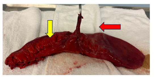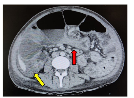 A 37-year-old male, who has been diagnosed with CD for 1 year, presented to the emergency department with a one-day history of diffuse abdominal pain and obstipation. The patient has been initially receiving Adalimumab as his treatment, which did not improve his overall clinical condition, before changing his gastroenterologist. His new gastroenterologist started him on Infliximab and a daily Prednisone dosage of 50mg by mouth. At presentation he reported the pain to have been diffuse and relentless similar to previous episodes but more severe and associated with bloating and obstipation. On physical exam he was ill-looking, cachectic with dull-sunken eyes. His abdomen was soft but distended, tympanic, and diffusely tender with involuntary guarding. His vital signs were stable. The patient’s blood work on admission revealed marked leukocytosis with a left shift, normal liver enzymes and an increased c-reactive protein. The patient was resuscitated with colloids and was started on wide spectrum antibiotics. Surgical consult was obtained next.