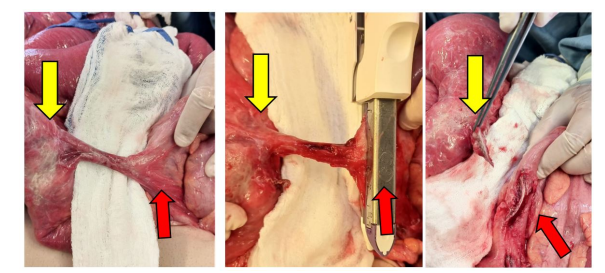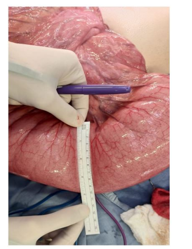 The sigmoid colon was slightly hyperemic but did not appear sick and no gross involvement with CD was observed. Thus, a fistulectomy was started by stapling the end of the ileosigmoidal fistula at the sigmoid colon using a purple 60mm GIA stapler without resecting the involved sigmoid (Figure 3). An enterectomy of the stenosed segment that included the fistula was performed using a 60mm purple GIA stapler about 3cm proximal to the ileocecal valve and no bowel continuity between the ileum and colon was established (Figures 4,5). A loop ileostomy was then extracted due to an inability to extract an end ileostomy given its very large diameter. This decision was taken given the intraabdominal condition of the bowels and colon and in order to avoid possible complications of a primary anastomosis. A hemovac drain was inserted and kept in the Douglas pouch. Finally, the abdomen was closed layer by layer in the respective manner in which it was opened.
