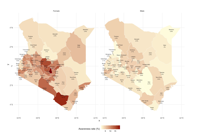 Results: Awareness was higher among females (8.6%) than males (3.0%) across most counties. Males showed persistently low awareness across all ages, while awareness increased with age, especially among females aged 25 to 49. County differences were notable: Kirinyaga, Taita Taveta, Laikipia, Tharaka-Nithi, and Kajiado had the highest female awareness, whereas Mandera, West Pokot, and Garissa showed low awareness in both sexes. Regression results indicated age had the strongest effect, followed by sex and region.