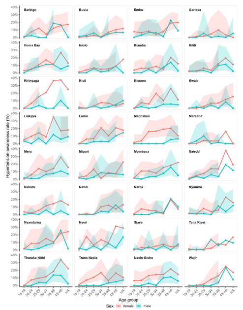 The awareness rate of hypertension, along with 95% confidence intervals, was estimated separately for females and males based on complex sampling structure of the survey data. Both overall (national) and subnational (county) estimates were generated, disaggregated by county and age group (15 to 24, 25 to 34, and 35 to 49 years ), each stratified by sex (male, female). The absolute difference in the awareness rate between females and males were computed, these were compared across the regions.