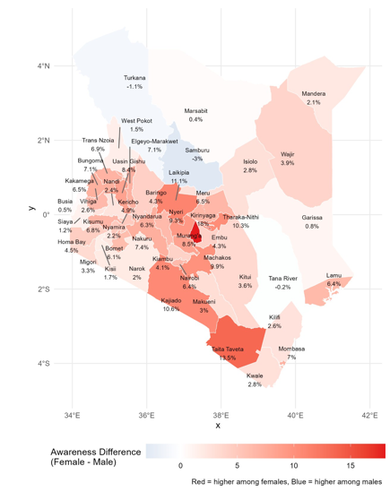 Interestingly, isolated cases in Turkana, Samburu, and Homa Bay showed male awareness rates approaching or exceeding those of females, may reflect data limitations, for instance sampling variability, small sub-samples, or reporting bias. Alternatively, they could signal localized sociocultural or programmatic dynamics that invert the typical gender pattern. Further investigation with more granular, representative data is warranted.