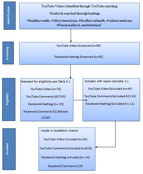 Data consistency and quality are enhanced by established criteria. Due of time constraints, information was gathered via official accounts and postings that used particular hash-tags (#culinarymedicine, #lifestylemedicine, #nutrition, #foodforyourhealth, #healthiswealth, #DiseasePrevention etc.). In order to analyze food preference, the study focuses on individuals rather than corporate entities. To avoid translation problems, non-English information is eliminated and a range of languages are anticipated. In order to gather useful insights, the study examined publicly accessible data from Facebook and YouTube, paying particular attention to posts that included pertinent hash-tags connected to food.