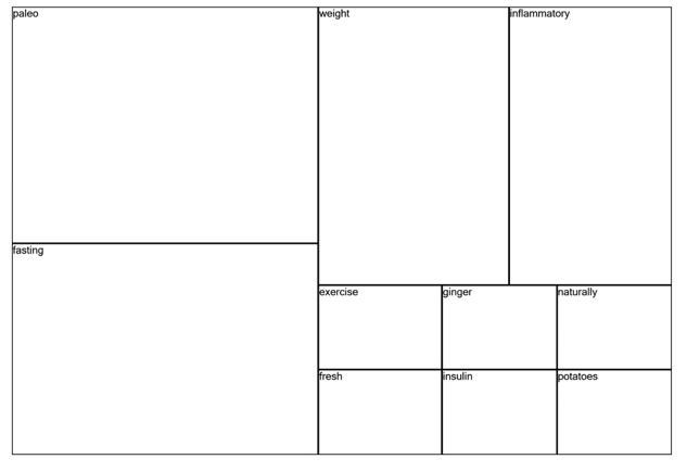 Using NVivo software, the treemap query of the YouTube and Facebook data was conducted up to 10 display words. The results showed that the top 10 words that respondents were discussed about were Peleo, fasting and weight management as well as exercise. These were the most important terms used by the online community.