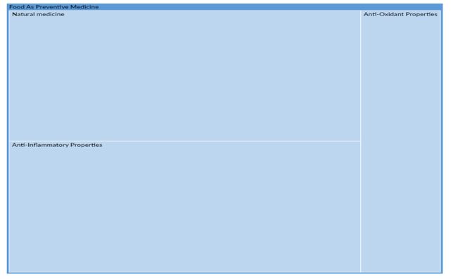 Food has been used to prevent disease from ancient times. This is reminiscent of the saying by Hippocrates of Cos (Greece, 5th–4th century BC), who is regarded as the founder of modern medicine: "Let food be your best medicine and your best medicine be your food."[39]. The concept of preventive medicine was already prematurely introduced by Hippocrates at that time. As a result of studying the environmental factors that contribute to sickness, the concept of special diet regimens was initially developed, focusing on the patient's overall health and recovery in addition to their food [40]. Any consumer's future health may be resolved in that situation by making appropriate dietary choices. Vegetables and fruits with deeper colors (like peaches and leafy greens) are typically higher in nutrients than those with lighter hues and whites [41]. Most fruits and vegetables should be eaten whole rather than in their juice since they offer more dietary fiber and satiety than their juice counterparts [41]. These findings are supported by the outcomes of intervention research [43]. Fruit and vegetable segments have been linked to lower mortality rates for the most part [44]. Observational studies have provided a robust and consistent body of evidence demonstrating that dietary patterns high in fruits and vegetables except for white potatoes are linked to a lower risk of cardiovascular disease [45,46]. The rationales presented above and the below comments demonstrate that people chose culinary foods because they believe that food can act as a preventive medication. The majority of viewers (n = 258) were examined. Food as Preventive medicine was the second major theme that arose from the analysis of user-generated content on social media.