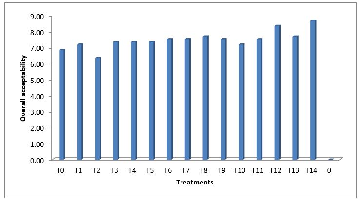As it is clearly evident from Table 1. The overall acceptability of the Treatment T14 containing 25% Bottle gourd, 00% carrot, 15% beet root and 25% sugar and was found to be maximum (8.66). Results showed increase in overall acceptability with incorporation of carrot and beetroot. However treatments containing beetroot percentage greater than 15% showed lower acceptability whereas increased percentage incorporation of carrot increased overall acceptability when compared with treatments containing carrot. Similar finding were reported by Bangar et al [11].
