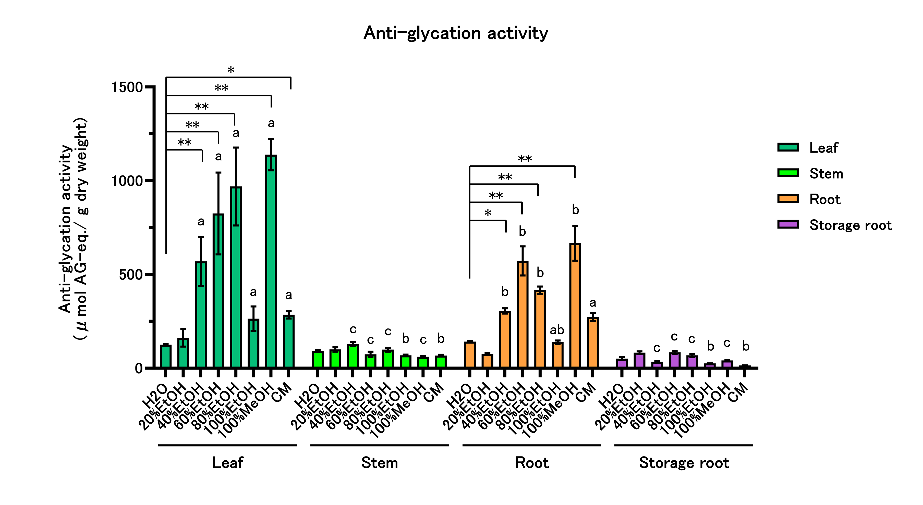 Sweet potato (Ipomoea batatas L.), a staple crop from the genus Ipomoea (Convolvulaceae), is valued for its dietary fiber and vitamins [7]. The main edible organ is the storage root; other parts, such as leaves, stems, and non-storage roots, are often discarded after harvest, underscoring a need for their effective utilization [8]. Studies of storage roots have identified diverse polyphenols, including caffeoylquinic acids (CQAs) [9, 10]. Most work has focused on antioxidant activity, and evidence for antiglycation activity is largely limited to purple sweet potato extracts [11, 12]. Because the extraction efficiency and bioactivity of plant antioxidants vary substantially with tissue and solvent [13, 14], detailed comparative studies in sweet potato remain scarce. Therefore, to better utilize underused sweet potato resources, we compared antiglycation activity of extracts from various plant parts and analyzed phenolic composition to identify part-specific characteristics.