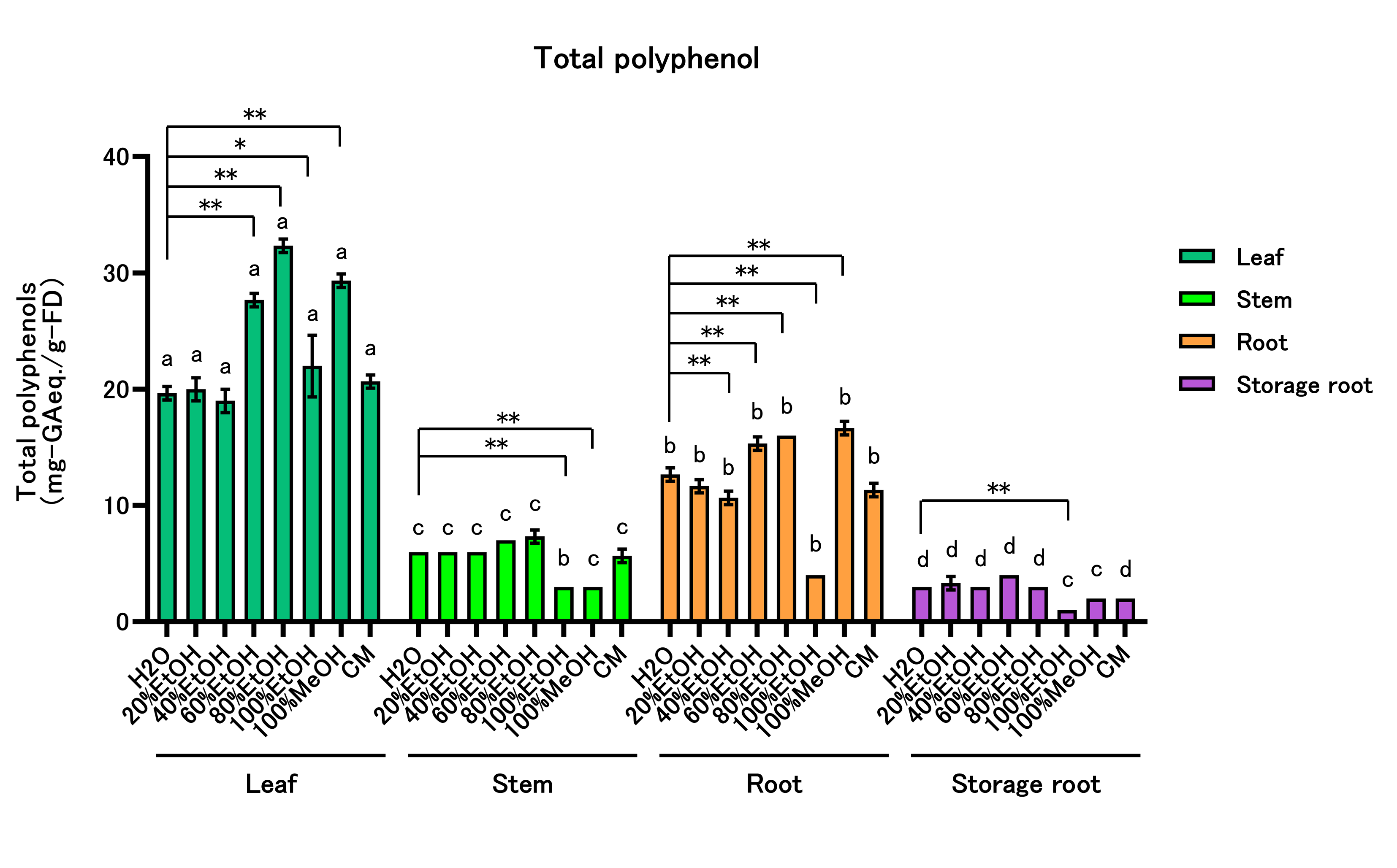 Total polyphenol content (TPC) was determined for all extracts (Figure 2, Supplementary Table 3). Within-part solvent effects: In leaves, TPC was highest in 60–100% EtOH and in 100% MeOH. In stems, TPC was lowest in 100% EtOH and 100% MeOH. In roots, TPC peaked in 60–80% EtOH and 100% MeOH but was lowest in 40% and 100% EtOH. In storage roots, TPC was lowest in 100% EtOH. Across-part comparisons within each solvent: TPC ranked leaf > root > stem > storage root in H₂O, 20–80% EtOH, and CM. In 100% EtOH, the order was leaf > stem = root > storage root; in 100% MeOH, leaf > root > stem = storage root.