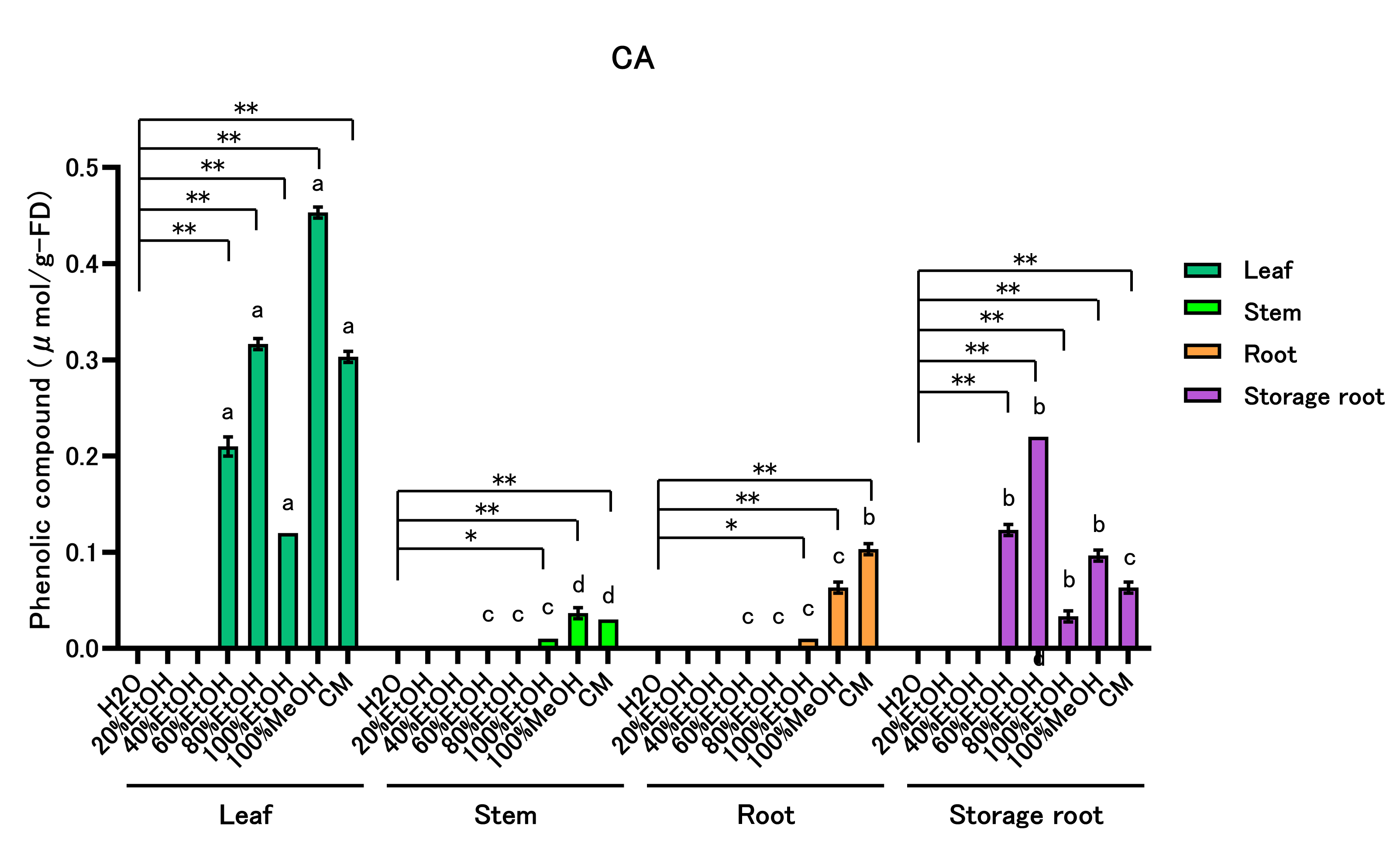 Caffeic acid (CA) content was quantified for all extracts (Figure 3; Supplemental Table 4). Within-part solvent effects: In leaves, CA content was highest in 60–100% EtOH, 100% MeOH, and CM. In stems and roots, CA peaked in 100% EtOH, 100% MeOH, and CM. In storage roots, CA was highest in 60–100% EtOH, 100% MeOH, and CM. Across-part rankings within each solvent: CA content ranked leaf > storage root > stem = root in 60%, 80%, and 100% EtOH; leaf > storage root > root > stem in 100% MeOH; and leaf > root > storage root > stem in CM.